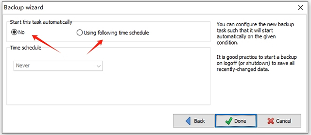6、自动备份设置功能,点击NO不让软件自动备份,以后可以手动点击开始备份,选择Using following time schedule可以设置自动备份计划。