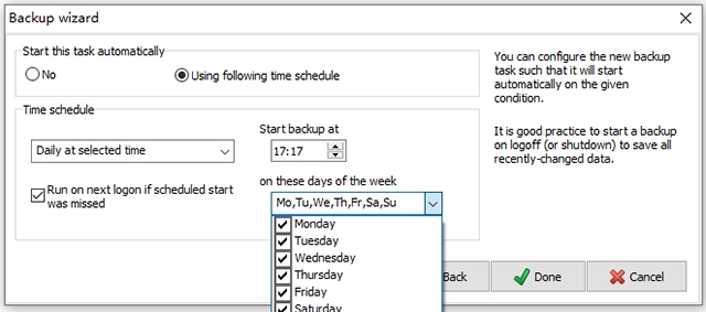 任务计划程序:当前选定的备份任务将添加到Windows任务计划程序中,并根据指定的时间计划自动执行