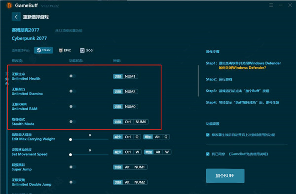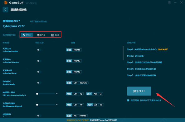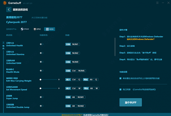 3、例如:赛博朋克2077,找到并进入赛博朋克2077修改器页面,即可看到其三十二项可修改功能,点击”加个BUFF“进入游戏后即可立即生效。