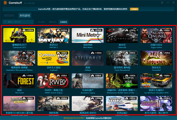 总找不到符合你游戏的修改器?那么可以试试gamebuff修改器,这是一款资源十分全面的单机游戏修改器,在这里不仅为玩家们提供了热门的鬼谷八荒、仁王2、三国群英传8等各种热门、经典、新作的游戏修改器,还每种游戏的修改器都划分为了steam版、epic版、gog版等多个游戏平台的版本以供使用,非常的强大。而且gamebuff游戏修改器使用起来也是非常的简单,只需要先运行游戏,再运行gamebuff,选择需要使用的游戏修改器,然后等待显示“buff加持成功”后即可根据软件中提供的修改项热键来经常操作启动即可,相当的便捷实用,毫不夸张的说这是单机游戏爱好者最爱的单机游戏修改器软件,欢迎有兴趣的用户们免费下载体验。