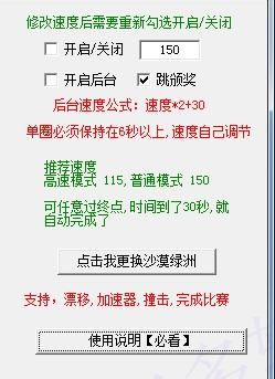 辅助可手动勾选功能和快捷键启动功能,创建个人模式添加AI,选择地图沙漠绿洲 打钩自动刷公里即可自动刷公里可以配合系统变速使用,具体的辅助上面有一个说明30自动挑战冠军:进入房间打钩功能 (此功能并非刷挑战者勿对号入座)