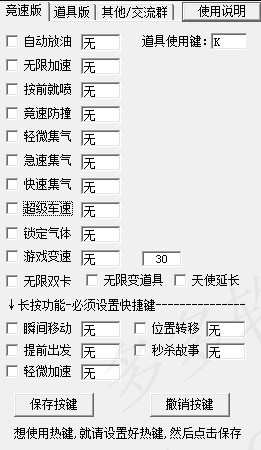 用于竞速模式 自动快速放加速器, 需要把跑跑Ctrl使用道具键换成K 此功能才会有效果