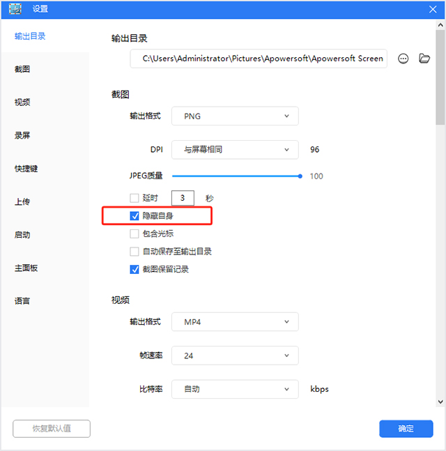 若在截图开始后,软件主界面挡住了需要截图的应用,可勾选隐藏自身,并点击确定以保存更改