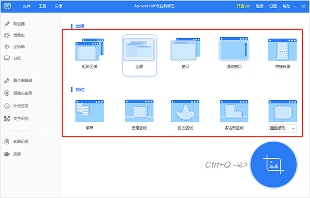 Apowersoft专业截屏王提供多种截图模式,如矩形区域、全屏、窗口、滚动窗口、菜单、固定区域、自由区域、多边形区域、圆角矩形等各项截图的选择。