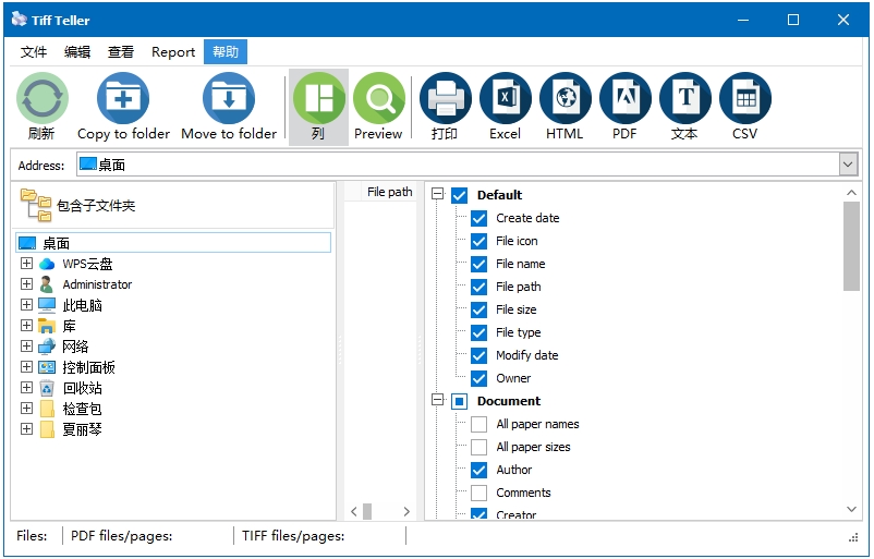 1、启动并导航 Tiff Teller 。如果点击PDF所在文件夹,PDF文件(如果有的话)将显示在右侧面板中。这里您可以看到文件参数,也包括页码。