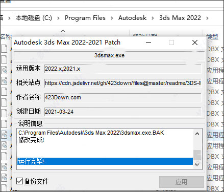 10、将注册机文件,复制到软件的根目录下,接着以管理员身份运行3dmax2022注册机,点击应用选择3ds Max 2020.exe;