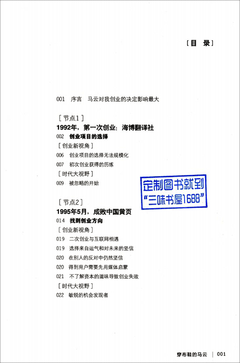001序言马云对我创业的决定影响最大 [节点1] 1992年,第一次创业:海博翻译社 002创业项目的选择 [创业新视角] 006创业项目的选择无法规模化 007初次创业获得的历练 [时代大视野] 009被忽略的开始 [节点2] 1995年5月,成败中国黄页 014找到创业方向 [创业新视角] 019二次创业与互联网相遇 019选择来自运气和对未来的坚信 020在别人的反对中仍然坚信 020得到用户需要先用媒体启蒙 021不了解资本的滋味导致创业失败 [时代大视野] 022敏锐的机会发现者 [节点3] 1997年12月,外经贸商务信息中心 026选择创业团队 [创业新视角] 029创业团队理念相同至关重要 [时代大视野] 030马云的学习时期 [节点4] 1999年1月,湖畔花园创立阿里巴巴 034建立清晰的愿景 [创业新视角] 038七年创业铺就了阿里巴巴 040互联网颠覆线下进出口贸易 [时代大视野] 041建立愿景,建立“神话” [节点5] 1999年,蔡崇信加入阿里巴巴 046要有懂资本的人才 [创业新视角] 049资本市场的人才是公司核心人才 [时代大视野] 051最重要的合伙人,往后退一步的合伙人 [节点6] 1999年10月,第一次融资:高盛 056如何取舍融资 [创业新视角] 059蔡崇信的加入为投资打下了基础 059第一笔投资的重要性 [时代大视野] 060阵容豪华的投资人 [节点7] 2000年1月,软银孙正义投资阿里巴巴 064理想的投资人 [创业新视角] 067有钱时拿钱才容易 068蔡崇信的才能再次发挥巨大作用 [时代大视野] 070又一个媒体“神话” [节点8] 2000年,首次危机,裁员 074扩展规模时最容易犯错 [创业新视角] 077没有盈利模式时有很多员工是危险的 078中国公司国际化步骤必须谨慎 [时代大视野] 079泡沫的遗产,示弱的艺术 [节点9] 2000年9月,西湖论剑,打造企业文化 084造势 [创业新视角] 090小公司的行业大格局 090互联网泡沫中抱团取暖 091品牌和市场活动早于产品出现 [时代大视野] 091武侠文化与借势金庸 [节点10] 2000年10月,中国供应商 096找到适合自己的模式 [创业新视角] 099将互联网观念浓缩成可售卖的产品 100统一思想提振士气同样是基础 [时代大视野] 102如何靠赚钱赢得舆论 [节点11] 2003年5月10日,再入湖畔花园做淘宝 106阿里生态系统的开始 [创业新视角] 110战略选择决定公司未来格局 110投资人带来的不只是资金 111成熟的商业项目运作 [时代大视野] 112淘宝,马云又讲了一个好故事 [节点12] 2003年至2006年,大战eBay 116找到一流的对手 [创业新视角] 119商业智慧以一当十 [时代大视野] 121战胜eBay就是最好的市场营销手段 [节点13] 2003年,创支付宝 124根据用户的需求创新 [创业新视角] 127走中国特色的道路 128没试过的人和事永远不要说不可能 [时代大视野] 129人们为什么乐于谈论支付宝 [节点14] 2004年6月,网商大会 134一定要有梦想 [创业新视角] 138为电子商务的生态圈鸣锣开道 [时代大视野] 140造词的艺术 [节点15] 2005年,杨致远和雅虎并入阿里巴巴 144连续犯错 [创业新视角] 148最大投资额再次震惊国内外 149雅虎投资是祸是福? [时代大视野] 150开始名满天下,谤亦随之 [节点16] 2006年,《赢在中国》任评委 154“创业名嘴”诞生 [创业新视角] 157能创业还能总结的企业家极少 [时代大视野] 159赢在电视 [节点17] 2007年11月,B2B上市 164抓准时机 [创业新视角] 166务实的商业模式 168创业者对上市时机的把握 [时代大视野] 169成为符号,但也开始沉默 [节点18] 2008年,做阿里云 174超前布局,拥抱变化 [创业新视角] 178淘宝之后又一重要战略选择 178不懂技术的创业者要会判断技术 [时代大视野] 179技术雄心 [节点19] 2009年,阿里造节,“双十一” 184C2B时代到来 [创业新视角] 187市场需求决定了节日的狂欢指数 [时代大视野] 190顺势造节 [节点20] 2010年,支付宝内资化、VIE事件、拆支付宝 194创业者面临的暴风雨 [创业新视角] 197在水中游泳的人都是很艰难的 [时代大视野] 201无法遏制的负面舆论 [节点21] 2010年,合伙人制度激活102年价值文化 206对未来的希望和信心 [创业新视角] 209阿里巴巴合伙人制度 [时代大视野] 210隔空论辩 [节点22] 2011年2月,诚信反腐 214触及底线 [创业新视角] 218抢业务增长量与规范管理的平衡 [时代大视野] 219透明化处理内部问题:“将伤口给别人看” [节点23] 2011年6月,淘宝一拆三,三拆七,七拆二十五 224组织结构大变革 [创业新视角] 227业务快速变化需要新组织结构支撑 [时代大视野] 229了不起的拆分试验 [节点24] 2013年5月,布局物流,做“菜鸟” 234对社会有敬畏之心 [创业新视角] 237电子商务生态系统的布局 [时代大视野] 238食言与圈地? [节点25] 2013年6月,余额宝诞生 242互联网思维向传统行业渗透 [创业新视角] 245进入更为艰难的领域 [时代大视野] 246余额宝冲击波 [节点26] 2014年,IT到DT,阿里巴巴的移动战略 250面向新经济体的布局 [创业新视角] 252两个视角看阿里巴巴的并购 [时代大视野] 253马云恐惧了吗 [节点27] 2014年9月,美国上市 258感恩过去,敬畏未来 [创业新视角] 261穿布鞋的马云 [时代大视野] 265喧嚣中上市 268附录马云演讲:与年轻人面对面
