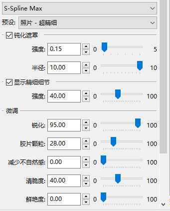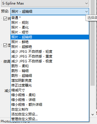 在S-Spline Max的预设类型中,包含了精细、鲜艳、减少不自然感、柔和等效果。如果想图像的质量更好、更清晰,可以选择“照片-超精细”这一预设。