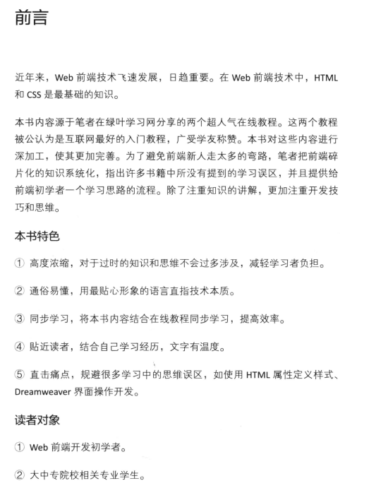 第一部分 HTML入门 第1章 HTML基础 2 1.1 Web技术简介 3 1.1.1 从网页制作到前端开发 3 1.1.2 前端技术 4 1.1.3 后端技术 7 1.1.4 从前端开发到后端开发的学习路线 8 【疑问】 9 1.2 HTML是什么? 10 1.3 HTML入门简介 11 1.3.1 教程说明 11 1.3.2 初学者比较关心的 问题 13 1.4 本章总结 13 第2章 前端开发工具 15 2.1 前端开发工具 16 2.1.1 Dreamweaver 16 2.1.2 Sublime Text 17 2.1.3 Visual Studio 17 2.2 新建HTML页面 18 第3章 HTML基本标签 20 3.1 HTML基本结构 21 3.1.1 HTML基本结构 21 3.1.2 用记事本编写网页 22 3.1.3 用Dreamweaver编写 网页 23 3.2 head标签 24 3.2.1 head标签内的title 标签 25 3.2.2 head标签内的meta 标签 25 3.2.3 head标签内的style标签 28 3.2.4 head标签内的script标签 28 3.2.5 head标签内的link标签 29 3.3 body标签 29 3.4 HTML注释 30 3.5 本章总结 32 训练题 33 第4章 段落与文字 34 4.1 段落与文字简介 35 4.2 标题标签 37 4.3 段落标签 39 4.3.2 段落标签39 4.3.2 换行标签40 4.4 文本格式化标签 42 4.4.1 粗体标签b、strong 42 4.4.2 斜体标签i、cite、em 43 4.4.3 上标标签sup 44 4.4.4 下标标签sub 44 4.4.5 大字号标签big和小字号标签small 45 4.4.6 删除线标签s 46 4.4.7 下划线标签u 47 4.5 水平线标签 48 4.6 div标签 49 4.7 网页特殊符号 50 4.7.1 网页中的空格 50 4.7.2 特殊符号 52 4.8 自闭合标签 54 4.8.1 什么叫自闭合标签 54 4.8.2 常见的自闭合标签 55 4.9 块元素和行内元素 55 4.9.1 块元素 56 4.9.2 行内元素 58 4.10 本章总结 59 4.11 训练题 61 第5章 列表 62 5.1 HTML列表简介 63 5.1.1 网页中的列表 63 5.1.2 HTML列表简介 63 5.2 有序列表 64 5.2.1 有序列表简介 64 5.2.2 有序列表type属性 65 5.3 无序列表 67 5.3.1 无序列表简介 67 5.3.2 无序列表type属性 68 5.3.3 深入了解无序列表 69 【疑问】 71 5.4 定义列表 72 5.5 HTML中的大误区 74 5.6 本章总结 75 5.7 训练题 78 第6章 表格 79 6.1 表格简介 80 6.2 表格基本结构 81 【疑问】 82 6.3 表格完整结构 82 6.3.1 表格标题caption 83 6.3.2 表头th 84 6.4 表格语义化 86 6.5 合并行rowspan 89 6.6 合并列colspan 90 6.7 本章总结 92 6.8 训练题 94 第7章 图像 95 7.1 图像标签 96 7.1.1 img标签src属性 96 7.1.2 img标签alt属性 97 7.1.3 img标签title属性 97 7.2 相对路径和绝对路径 98 7.2.1 “网页1”引用海贼王图片 99 7.2.2 “网页2”引用海贼王图片 99 【疑问】 100 7.3 图片格式 101 7.3.1 位图 101 7.3.2 矢量图 103 7.3.3 位图与矢量图区别 105 【疑问】 105 7.4 本章总结 106 第8章 超链接 108 8.1 超链接简介 109 8.2 a标签 109 8.2.1 a标签简介 109 8.2.2 a标签target属性 110 8.2.3 各种超链接 111 8.3 内部链接 112 8.4 锚点链接 114 8.5 本章总结 117 第9章 表单 118 9.1 表单简介 119 9.2 form标签 120 9.2.1 form标签简介 120 9.2.2 form标签属性 121 9.2.3 表单对象 126 9.3 input标签简介 126 9.4 单行文本框text 127 9.4.1 文本框text简介 127 9.4.2 文本框text属性 128 9.5 密码文本框password 129 9.5.1 密码文本框简介 129 9.5.2 密码文本框属性 131 9.6 单选按钮radio 132 9.6.1 单选按钮简介 132 9.6.2 单选按钮radio的忽 略点 133 【疑问】 135 9.7 复选框checkbox 135 9.8 表单按钮 137 9.8.1 普通按钮button 137 9.8.2 提交按钮submit 138 9.8.3 重置按钮reset 139 9.8.4 普通按钮、提交按钮和重置按钮的区别 141 9.9 图片域image 142 【疑问】 143 9.10 隐藏域hidden 143 9.11 文件域file 145 9.12 多行文本框textarea 146 9.13 下拉列表select 148 9.13.1 select标签属性 149 9.13.2 option标签属性 151 【疑问】 153 9.14 input标签按钮与button标签按钮 153 【疑问】 155 9.15 本章总结 155 【疑问】 157 9.16 训练题 158 第10章 多媒体 159 10.1 网页中插入音频和视频 160 10.2 网页中插入背景音乐 162 10.3 网页中插入Flash 163 10.4 本章总结 164 第11章 框架 165 11.1 浮动框架iframe 166 11.1.1 iframe简介 166 11.1.2 iframe滚动条 167第二部分 CSS入门 第12章 CSS基础 170 12.1 CSS是什么 171 12.1.1 CSS简介 171 12.1.2 CSS和CSS3 172 12.2 CSS入门简介 172 12.3 CSS的三种引用方式 173 12.3.1 外部样式表 173 12.3.2 内部样式表 174 12.3.3 内联样式表 175 第13章 CSS选择器基础 177 13.1 元素的id和class 178 13.1.1 元素的id属性 178 13.1.2 元素的class属性 178 13.2 什么叫CSS选择器? 179 13.3 CSS选择器入门(上) 181 13.3.1 元素选择器 181 13.3.2 id选择器 183 13.3.3 class选择器 184 13.4 CSS选择器入门(下) 186 13.4.1 子元素选择器 186 13.4.2 相邻选择器 187 13.4.3 群组选择器 189 第14章 字体样式 191 14.1 字体样式简介 192 14.2 字体类型font-family 193 14.3 字体大小font-size 195 14.4 字体颜色color 198 14.5 字体粗细font-weight 200 14.6 字体斜体font-style 202 14.7 CSS注释 204 14.8 本章总结 206 第15章 文本样式 209 15.1 文本样式简介 210 15.2 下划线、删除线和顶划线text-decoration 210 15.2.1 text-decoration属性 210 15.2.2 下划线、删除线和顶划线的用途分析 213 15.3 文本大小写text-transform 214 15.4 font-variant属性 215 【疑问】 216 15.5 首行缩进text-indent 216 15.6 文本水平对齐text-align 218 15.7 行高line-height 219 15.8 字母间距letter-spacing和词间距word-spacing 221 15.8.1 letter-spacing属性 221 15.8.2 word-spacing属性 222 15.9 文本样式总结 223 第16章 边框样式 228 16.1 边框样式简介 229 16.2 整体边框样式 230 16.2.1 边框的属性 230 16.2.2 边框实例 233 16.2.3 border属性简洁写法 233 16.3 局部边框样式 234 16.4 本章总结 237 第17章 背景样式 240 17.1 背景样式简介 241 17.1.1 背景颜色 241 17.1.2 背景图像 241 17.2 背景颜色background-color 242 17.3 背景图像简介 244 17.3.1 background-image属性 244 17.3.2 background-repeat属性 244 1