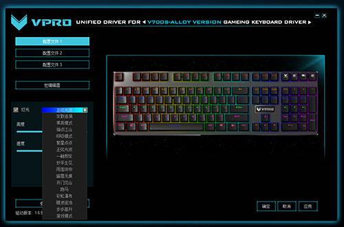 1、配套驱动软件,可以保存3组配置文件(宏定义设置、灯光设置、自定义设置等)。全103键可独立编程(FN键除外),跳出界定,个性化主宰。