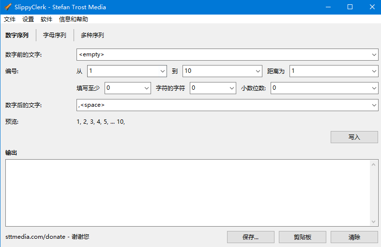 当然,这个系列已经相当不错了,但也许你也想写其他系列。只需在顶部的设置中尝试一下以适应应用程序。例如,您可以在数字前面或后面更改文本。目前,没有文本前面定义的数字,而是逗号和数字之后的空格。只需在框中键入任何文本或空间,然后将它们与数字一起输出,看看发生了什么。此外,还可以更改序列的起点和终点、每个数字之间的距离、可以将填充更改为特定长度或使用小数位。只要尝试一些个别的可能性,没有什么可以出错,在预览中你总是可以看到当前的结果