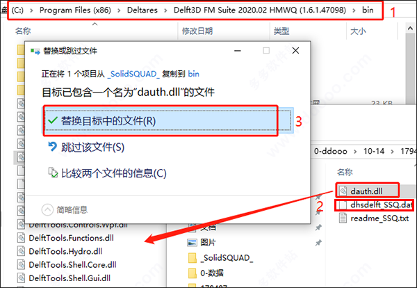 7、打开_SolidSQUAD_文件夹,将文件“dhsdelft_SSQ.dat复制到计算机安全位置,如安装目录中。再将文件“ dauth.dll”复制到安装目录下的bin文件夹内并进行替换;