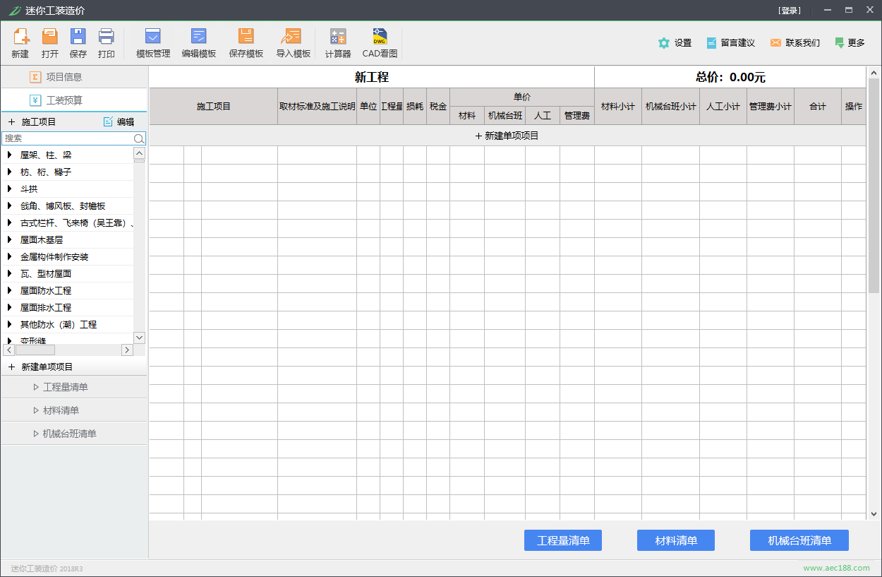 3、快速完成工程量清单、材料详细清单、机械人工清单;