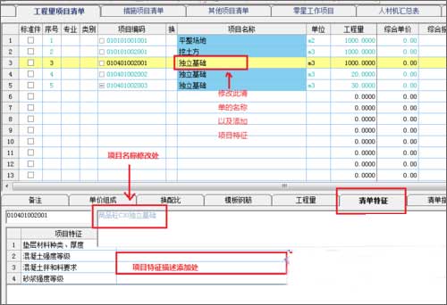 3、在新点软件当中,项目名称的修改和项目特征的录入均在下方的选项卡中统一完成,是不能在清单中直接修改的。