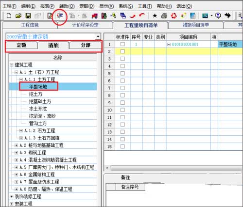 2、第二种清单录入的方法,可以点击上面工具栏第六个按钮(定额书显示),选择清单选项卡,进入清单中寻找自己需要的清单项,双击添加到工程量项目清单中。