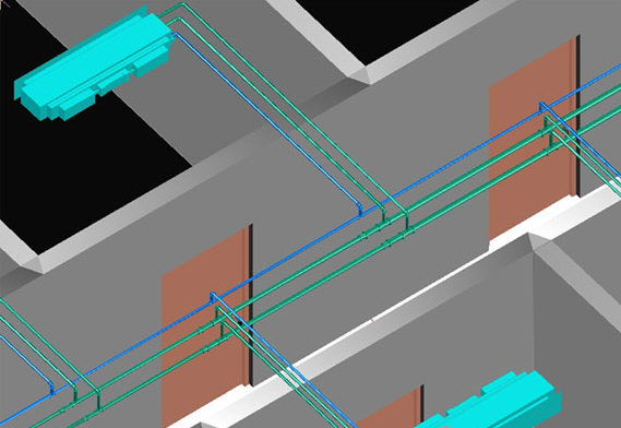 管道、设备等实体支持双击、夹点编辑操作。管道与管道、附件、标注之间存在连接关系,当管道或附件夹点移动或尺寸变化时,与之相连的实体会自动移动、适应性尺寸变化,保持连接位置、尺寸的完好、标注数值的正确;所有管道,包括风管、水管之间都能自动处理遮挡关系。