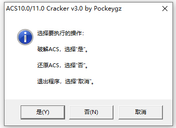 9、激活程序包含两种功能,其一是破解功能,其二是还原功能。ACS被破解后,当需要升级更新时,应首先运行破解程序并选择执行还原功能,把ACS还原至官方原版,以免导致升级失败。功能选择在以下对话框中进行: