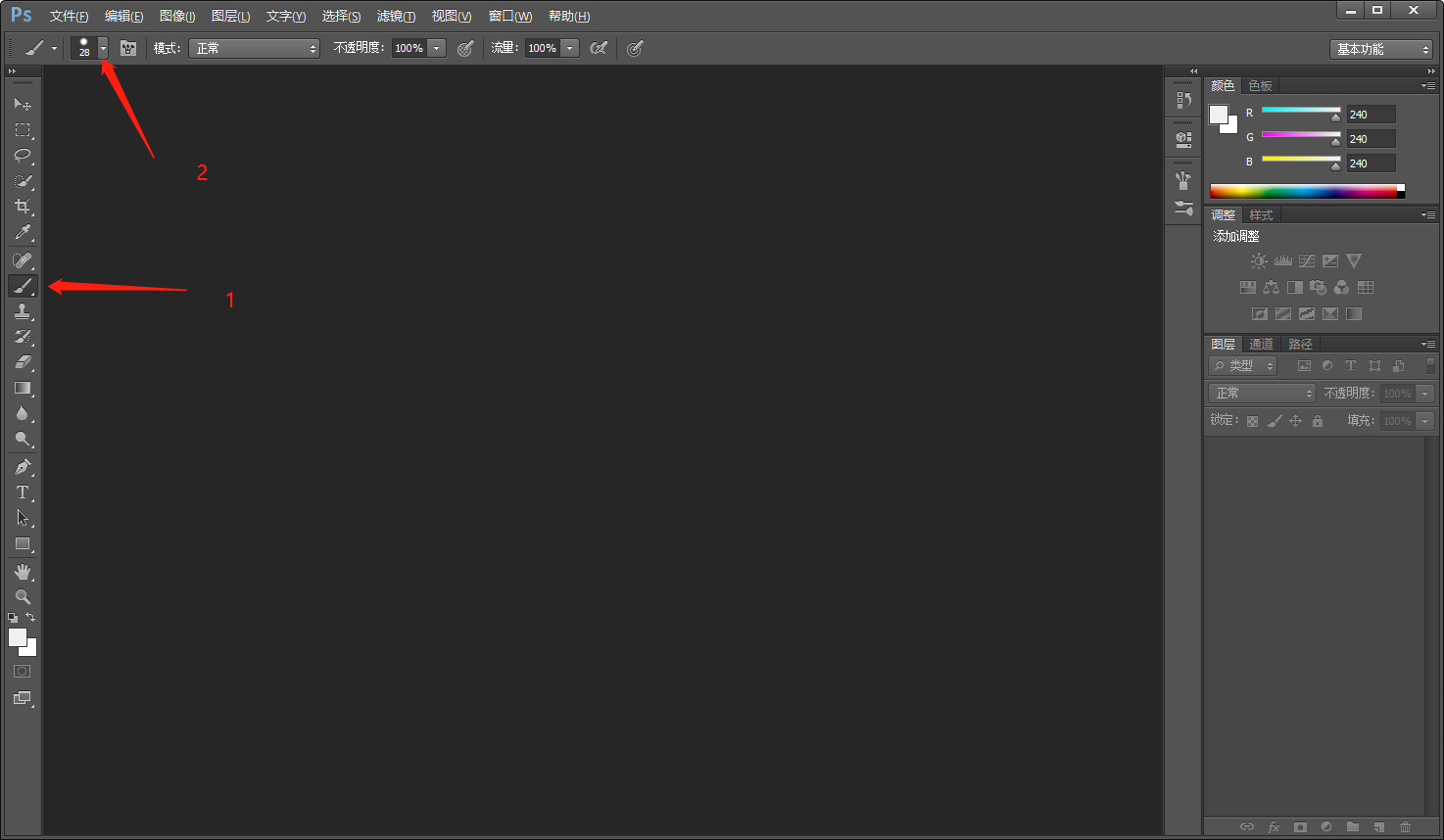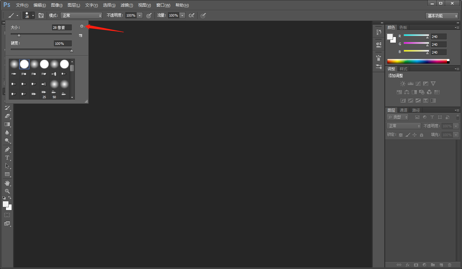 1、在PS界面中选择画笔工具,点击画笔预设按钮。