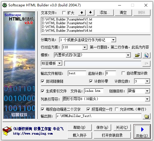 软景HTML制造机(Softscape HTML Builder)是由软景工作室推出的一款基于模板的将文本文件转换为网页文件的工具软件。用户只需把文章的题目、内容按顺序放在文本文件里,一键即可快速生成带索引文件、“上一页”“下一页”链接的HTML文件群。软件内置10套不同风格的精美模板,不会做网页也可以轻松使用,是一款快速制作e-book电子书,“书屋”、“技巧”类站点的得力助手,有需求的用户不妨下载体验!