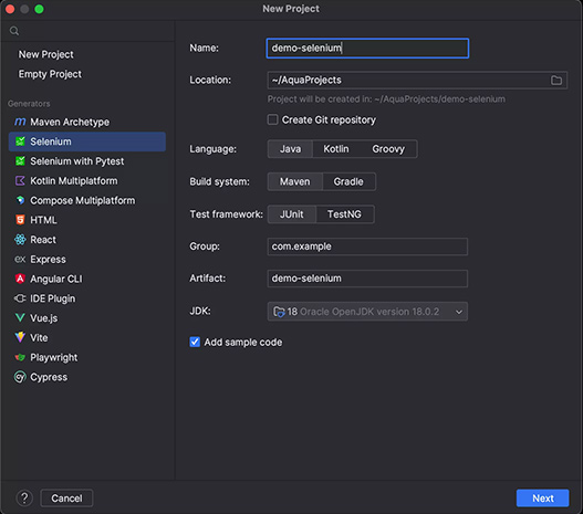 Aqua 可以为 JVM 堆栈生成新的 UI 测试项目,您可以在 New Project(新建项目)向导中指定 JDK、构建工具(Maven 或 Gradle)、测试运行程序(JUnit 或 TestNG)和语言。