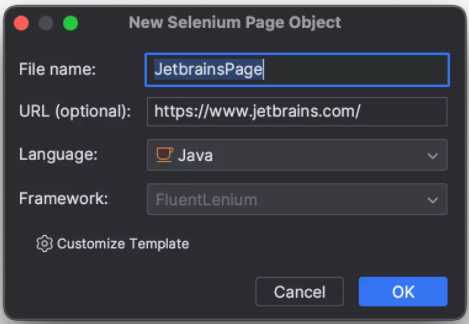 在采用页面对象模型模式时,IDE 可以帮助您从 New File(新建文件)菜单创建并维护新的页面对象文件,并且在添加定位器时遵循所选页面对象模式。