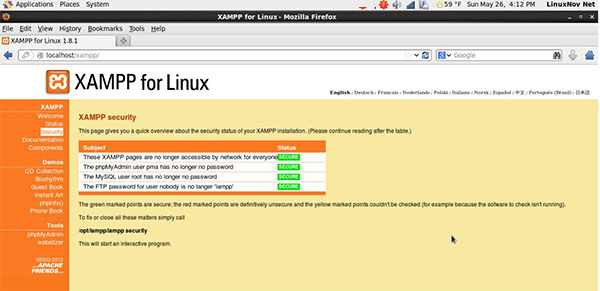为了让您安装的XAMMP更安全即将启动一个安全检查过程,例如,这可以防止通过默认的用户名('lampp') 和默认的密码组合非法访问XAMPP的演示页面。