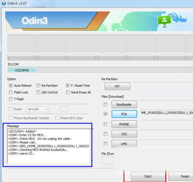 3、在Odin3点击pda选择你下载好的刷机包,这时候会卡一会,稍等出现蓝色框的文字,然后点击start开始刷机,刷机完毕后会自动重启;