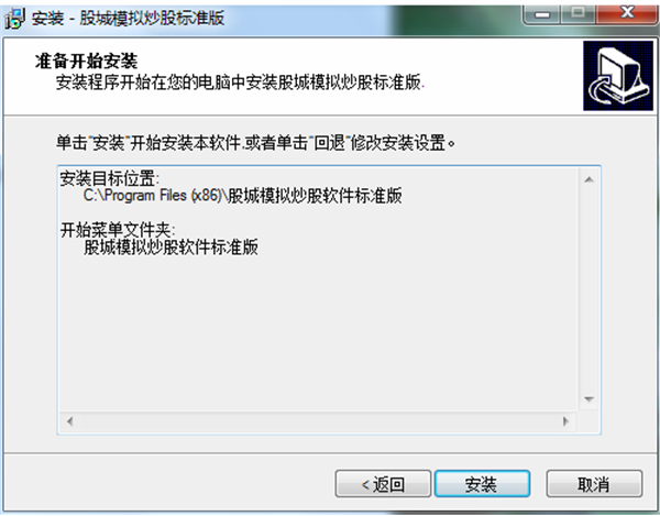 4、准备开始安装,安装程序开始在您的电脑中安装股城模拟炒股软件,点击安装开始安装本软件,点击返回可修改之前的安装设置。