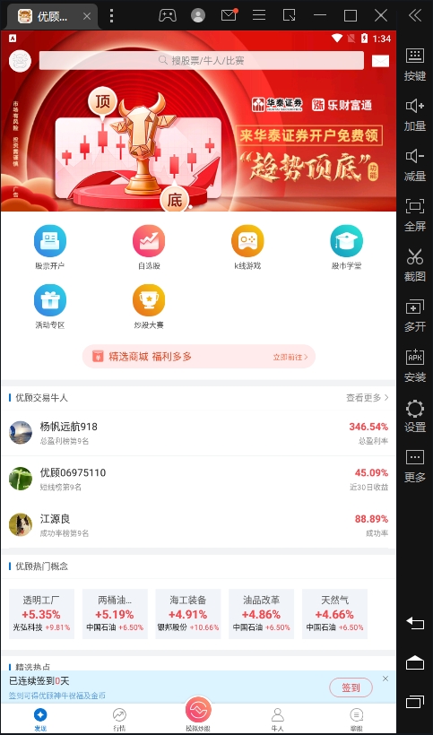 优顾炒股电脑版是由北京金汇盛世移动科技有限公司打造且运行在安卓模拟器上的一款非常方便实用的股票模拟交易到实战都有的软件,如果你想学习炒股,如果你想知道更多关于股票的知识与行情,那就来下载优顾炒股电脑版吧,这里有虚拟的资金真实的交易,实时行情与实盘完全一致,更新速度超过市面上99%的软件,成交量与实盘一致,模拟交易高仿真,优顾用户可以自定义创建或参与炒股比赛,是朋友交流,高校学习炒股最佳的炒股平台,如果你对学习股票方面知识有兴趣欢迎前来下载使用。