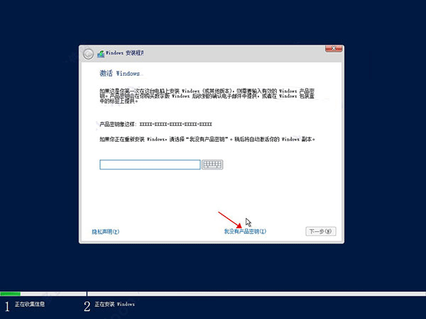 5、秘钥可以先选择“没有产品秘钥”选项,如下图所示: