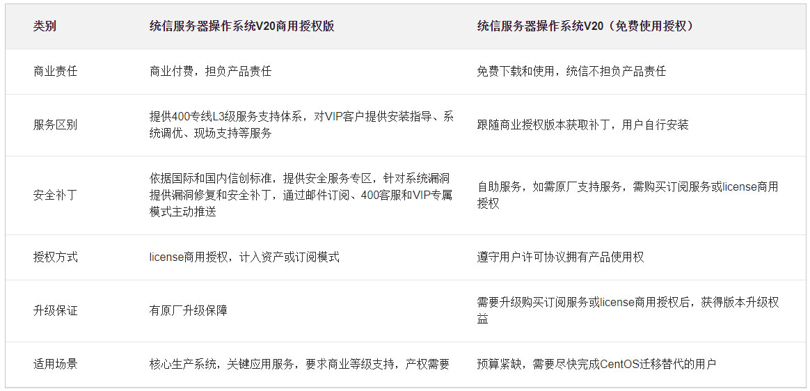 为帮助用户与合作伙伴更低成本、更方便地使用中国操作系统应对CentOS停更的挑战,统信软件决定为广大中国用户及合作伙伴提供统信服务器操作系统的免费使用授权!统信服务器操作系统V20的免费使用授权,可无限制体验统信服务器操作系统的产品功能,并可通过购买授权或订阅获取商用服务。
