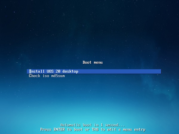 1、载入统信uos教育版镜像完毕,选择“Install UOS 20 desktop”开始安装UOS系统。