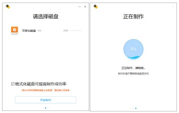 5 弹框中将显示刚插入的U盘,单击选中,并勾选“格式化磁盘可提高制作成功率”,单击【开始制作】。