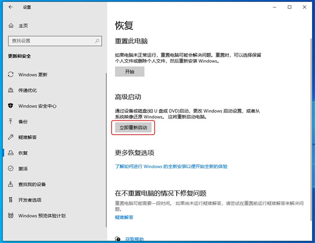2)在更新和安全页面,单击【恢复】>【高级启动】>【立即重新启动】。