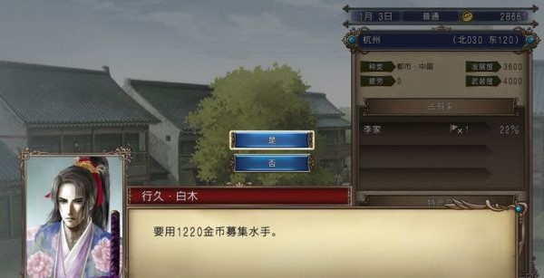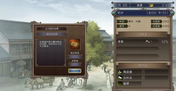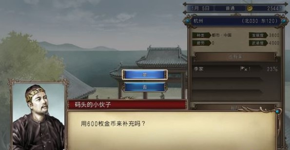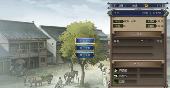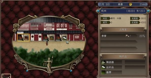 你的初始地在杭州,你可以点击主城界面的各个图标按钮,查看游戏的系统内容。