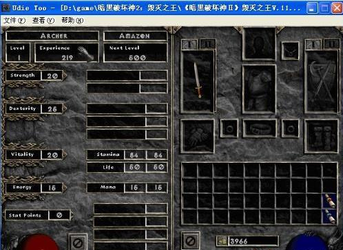 由于更新成1.10以后,人物的属性都有了上限。例如:生命法力上限是8191。基本属性(如力量)是1023。技能等级99(但最高能改20)。人物等级只能通过经验来修改,99的经验好象是3,522,000,000。编辑方法:点击属性的数字,修改!这里特别注意一下:由于上限的限制!一旦你编辑的数值超过上限,游戏就会把你所添的数字重置为减去上限值。例如你把力量改成1300,进游戏后就会变成1300-1024=276