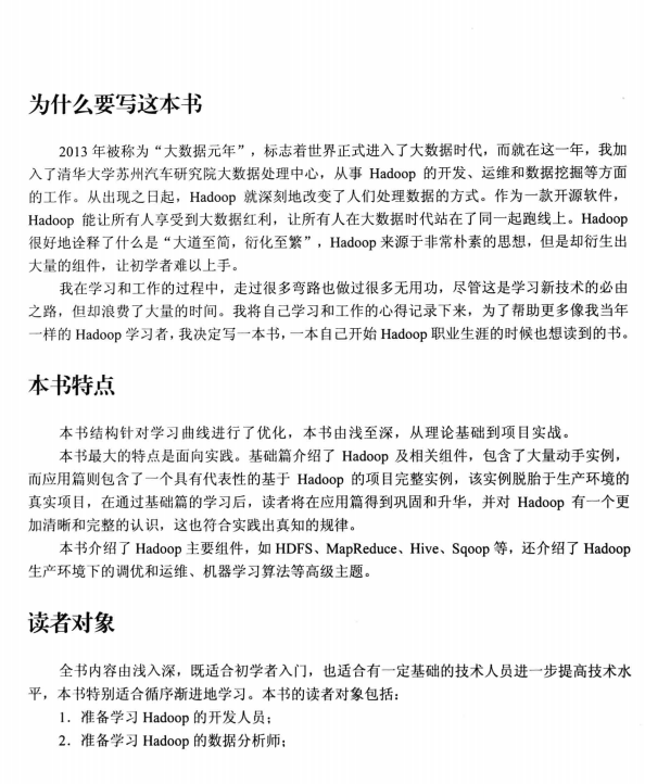 作为大数据领域的重要工具,Hadoop的学习对于想进入这个行业的同学非常重要。这本书不仅讲解理论知识,还注重实践,适合用来提升技能。虽然内容有点多,但只要按照章节顺序学习,应该不难掌握。总体来说,是一本很好的学习和参考书!