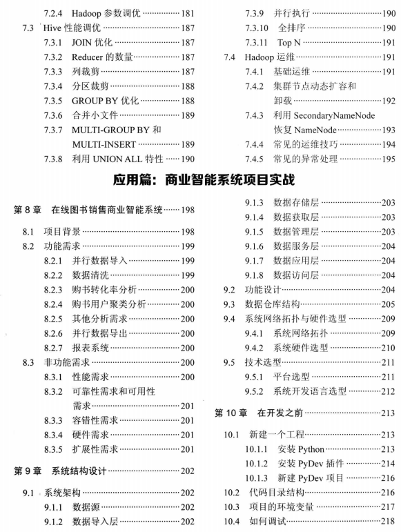 基础篇:Hadoop基础 第1章 绪论 1.1 Hadoop和云计算 1.1.1 Hadoop的电梯演讲 1.1.2 Hadoop生态圈 1.1.3 云计算的定义 1.1.4 云计算的类型 1.1.5 Hadoop和云计算 1.2 Hadoop和大数据 1.2.1 大数据的定义 1.2.2 大数据的结构类型 1.2.3 大数据行业应用实例 1.2.4 Hadoop和大数据 1.2.5 其他大数据处理平台 1.3 数据挖掘和商业智能 1.3.1 数据挖掘的定义 1.3.2 数据仓库 1.3.3 操作数据库系统和数据仓库系统的区别 1.3.4 为什么需要分离的数据仓库 1.3.5 商业智能 1.3.6 大数据时代的商业智能 第2章 环境准备 2.1 Hadoop的发行版本选择 2.1.1 Apache Hadoop 2.1.2 CDH 2.1.3 Hadoop的版本 2.1.4 如何选择Hadoop的版本 2.2 Hadoop架构 2.2.1 Hadoop HDFS架构 2.2.2 Hadoop MapReduce架构 2.2.3 Hadoop架构 2.3 安装Hadoop 2.3.1 安装运行环境 2.3.2 修改主机名和用户名 2.3.3 配置静态IP地址 2.3.4 配置SSH无密码连接 2.3.5 安装JDK 2.3.6 配置Hadoop 2.3.7 格式化HDFS 2.3.8 启动Hadoop并验证安装 2.4 安装Hive 2.4.1 安装元数据库 2.4.2 修改Hive配置文件 2.4.3 验证安装 2.5 安装Sqoop 2.6 Eclipse Hadoop插件的安装和使用 2.6.1 安装并配置Eclipse Hadoop插件 2.6.2 Eclipse插件的使用 第3章 Hadoop的基石:HDFS 3.1 认识HDFS 3.1.1 HDFS的设计理念 3.1.2 HDFS的架构 3.1.3 HDFS容错 3.2 HDFS读取文件和写入文件 3.2.1 块的分布 3.2.2 数据读取 3.2.3 写入数据 3.2.4 数据完整性 3.3 如何访问HDFS 3.3.1 命令行接口 3.3.2 Java API 3.3.3 其他常用的接口 3.3.4 Web UI 第4章 分而治之的智慧:MapReduce 4.1 认识MapReduce 4.1.1 MapReduce的编程思想 4.1.2 MapReduce运行环境 4.1.3 MapReduce作业和任务 4.1.4 MapReduce的计算资源划分 4.1.5 MapReduce的局限性 4.2 Hello WordCount 4.2.1 WordCount的设计思路 4.2.2 编写WordCount 4.2.3 运行程序 4.2.4 还能更快吗 4.3 MapReduce的过程 4.3.1 从输入到输出 4.3.2 input 4.3.3 map及中间结果的输出 4.3.4 shuffle 4.3.5 reduce及最后结果的输出 4.3.6 sort 4.3.7 作业的进度组成 4.4 MapReduce的工作机制 4.4.1 作业提交 4.4.2 作业初始化 4.4.3 任务分配 4.4.4 任务执行 4.4.5 任务完成 4.4.6 推测执行 4.4.7 MapReduce容错 4.5 MapReduce编程 4.5.1 Writable类 4.5.2 编写Writable类 4.5.3 编写Mapper类 4.5.4 编写Reducer类 4.5.5 控制shuffle 4.5.6 控制sort 4.5.7 编写main函数 4.6 MapReduce编程实例:连接 4.6.1 设计思路 4.6.2 编写Mapper类 4.6.3 编写Reducer类 4.6.4 编写main函数 4.7 MapReduce编程实例:二次排序 4.7.1 设计思路 4.7.2 编写Mapper类 4.7.3 编写Partitioner类 4.7.4 编写SortComparator类 4.7.5 编写Reducer类 4.7.6 编写main函数 4.8 MapReduce编程实例:全排序 4.8.1 设计思路 4.8.2 编写代码 第5章 SQL on Hadoop:Hive 5.1 认识Hive 5.1.1 从MapReduce到SQL 5.1.2 Hive架构 5.1.3 Hive与关系型数据库的区别 5.1.4 Hive命令的使用 5.2 数据类型和存储格式 5.2.1 基本数据类型 5.2.2 复杂数据类型 5.2.3 存储格式 5.2.4 数据格式 5.3 HQL:数据定义 5.3.1 Hive中的数据库 5.3.2 Hive中的表 5.3.3 创建表 5.3.4 管理表 5.3.5 外部表 5.3.6 分区表 5.3.7 删除表 5.3.8 修改表 5.4 HQL:数据操作 5.4.1 装载数据 5.4.2 通过查询语句向表中插入数据 5.4.3 利用动态分区向表中插入数据 5.4.4 通过CTAS加载数据 5.4.5 导出数据 5.5 HQL:数据查询 5.5.1 SELECT…FROM语句 5.5.2 WHERE语句 5.5.3 GROUP BY和HAVING语句 5.5.4JOIN语句 5.5.5 ORDER BY和SORT BY语句 5.5.6 DISTRIBUTE BY和SORTBY语句 5.5.7 CLUSTER BY 5.5.8 分桶和抽样 5.5.9 UNION ALL 5.6 Hive函数 5.6.1 标准函数 5.6.2 聚合函数 5.6.3 表生成函数 5.7 Hive用户自定义函数 5.7.1 UDF 5.7.2 UDAF 5.7.3 UDTF 5.7.4 运行 第6章 SQL to Hadoop : Sqoop 6.1 一个Sqoop示例 6.2 导入过程 6.3 导出过程 6.4 Sqoop的使用 6.4.1 codegen 6.4.2 create-hive-table 6.4.3 eval 6.4.4 export 6.4.5 help 6.4.6 import 6.4.7 import-all-tables 6.4.8 job 6.4.9 list-databases 6.4.10 list-tables 6.4.11 merge 6.4.12 metastore 6.4.13 version 第7章 Hadoop性能调优和运维 7.1 Hadoop客户端 7.2 Hadoop性能调优 7.2.1 选择合适的硬件 7.2.2 操作系统调优 7.2.3 JVM调优 7.2.4 Hadoop参数调优7.3 Hive性能调优 7.3.1 JOIN优化 7.3.2 Reducer的数量 7.3.3 列裁剪 7.3.4 分区裁剪 7.3.5 GROUP BY优化 7.3.6 合并小文件 7.3.7 MULTI-GROUP BY和MULTI-INSERT