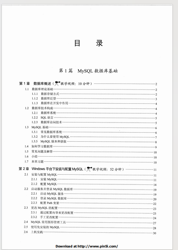 mysql入门很简单共分5篇。第1篇介绍数据库的基本知识、在windows平台下安装mysql数据库、在linux平台下安装mysql数据库;第2篇介绍mysql数据类型、创建和删除数据库、数据库存储引擎、创建表、修改表、删除表、索引、视图、触发器;第3篇介绍查询数据、插入数据、更新数据、删除数据、mysql运算符、mysql函数、存储过程和函数;第4篇介绍mysql用户管理、数据备份、数据还原、mysql日志、性能优化;第5篇介绍java访问mysql数据库、php访问mysql数据库、c#访问mysql数据库,最后还提供了一个项目实战案例。