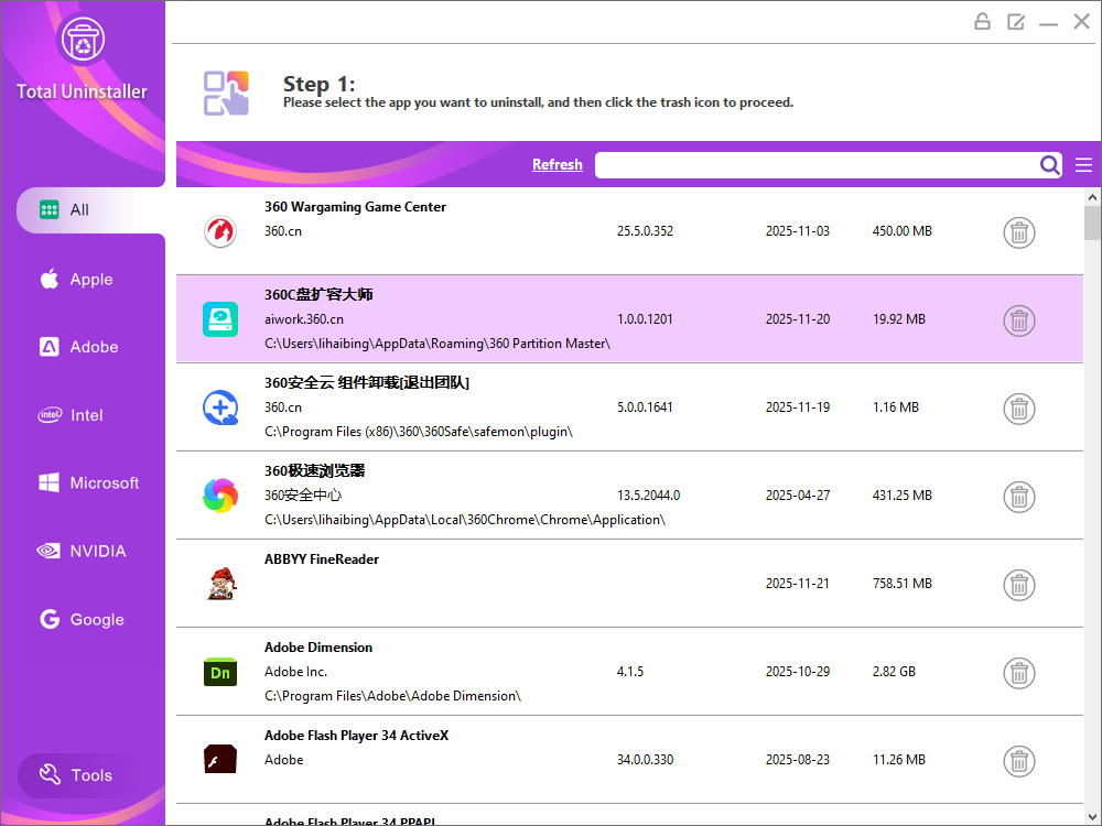查找待卸载应用变得直观且简单:按应用名称搜索,按应用图标和名称滚动查找应用,按主要厂商、硬盘、名称和大小排序应用。