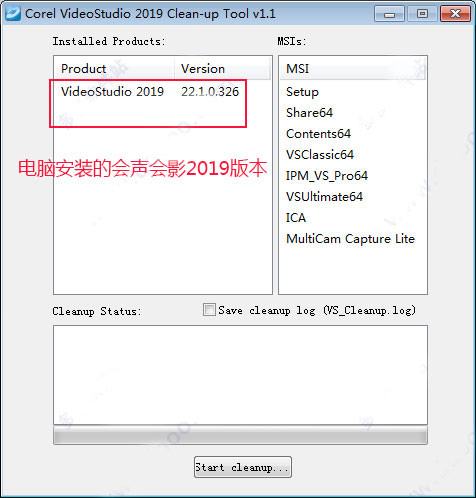 2、出现一个2019的版本信息,点击“start cleanup”开始卸载;