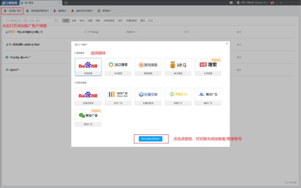在页面左上角找到“添加推广账户”按钮,点击打开选择媒体弹窗,找到要添加的媒体对应的图标,单击;
