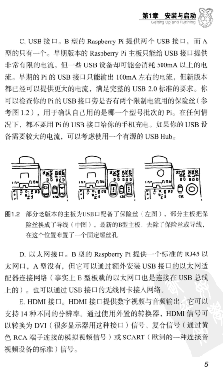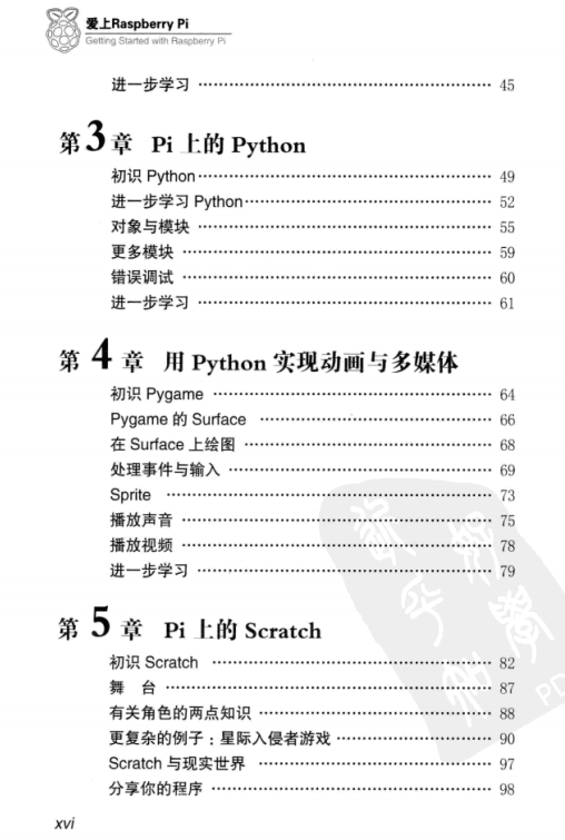 第1章 安装与启动 主 板 必备的外设 外 壳 选择操作系统 烧录 SD 卡 启动系统 配置你的 Pi 关闭系统 故障排除 进一步学习 第2章 初识 Raspberry Pi 上的 Linux 使用命令行 文件与文件系统 更多 Linux 命令 进 程 sudo 与权限 网 络 /etc 目录 设置日期时间 安装新软件 进一步学习 第3章 Pi 上的 Python 初识 Python 进一步学习 Python 对象与模块 更多模块 错误调试进一步学习 第4章 用 Python 实现动画与多媒体 初识 Pygame Pygame 的 Surface 在 Surface 上绘图 处理事件与输入 Sprite 播放声音 播放视频 进一步学习 第5章 Pi 上的 Scratch 初识 Scratch 舞 台 有关角色的两点知识 更复杂的例子 :星际入侵者游戏 Scratch 与现实世界 分享你的程序 进一步学习 第6章 Arduino 与 Pi 在 Raspbian 上安装 Arduino 定位串口 串口通信 进一步学习 第7章 基本输入输出 使用输入输出接口 数字信号输出 :点亮 LED 数字信号输入 :读取按钮状态 项目 :定时台灯 脚本命令 连接台灯 用 cron 设置定时任务 更多有关 cron 的知识 进一步学习 第8章 用 Python 进行输入输出编程 在 Python 中安装并测试 GPIO 让 LED 闪烁 读取按钮状态 项目 :简易发音板 进一步学习 第9章 使用摄像头 测试摄像头 安装并测试 SimpleCV 显示图片 修改图片 操作摄像头 人脸检测 项目 :Raspberry Pi 照相馆 进一步学习 第10章 Python 与 Internet 从 Web 服务器下载数据 获取天气预报 用 Pi 提供服务(做 Web 服务器) Flask 入门 把 Web 与现实世界相连 项目 :Web 台灯 进一步学习 附录 A 烧录 SD 卡镜像 附录 B 星际入侵者游戏完整版 附录 C 模拟信号输入