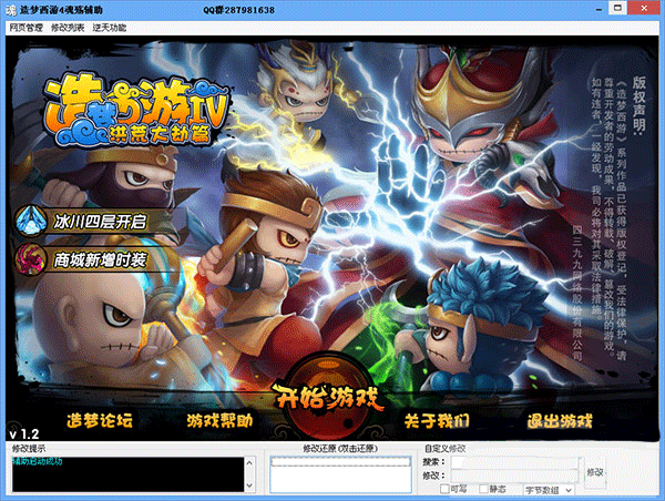 造梦西游是目前网络上最优秀的网页游戏,目前已经全新升级为造梦西游4洪荒大劫篇,新版本增加了丰富的关卡,丰富的怪物和装备,冰川四层开启,商城新增时装,将带给玩家更为非凡的游戏新体验。但游戏难度也大幅度增加了,为此小编特别为广大网友带来了造梦西游4魂殇修改器,它是目前由魂殇玩家针对页游平台《造梦西游4》而设计制作的游戏修改器,具备优化内存、刷新游戏、清理白屏、爆率修改、刷图必备、buff替换、技能速度加快等等功能,能够帮助玩家更好的自由体验游戏,是目前网络上最好用的魂殇4399造梦西游4辅助,喜欢的玩家可下载收藏。