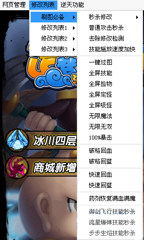 爆率修改、飞人模式修改、技能打所有怪、技能速度加快、人物移动速度变快(无法跳跃)、物品修改、人物转职等等。