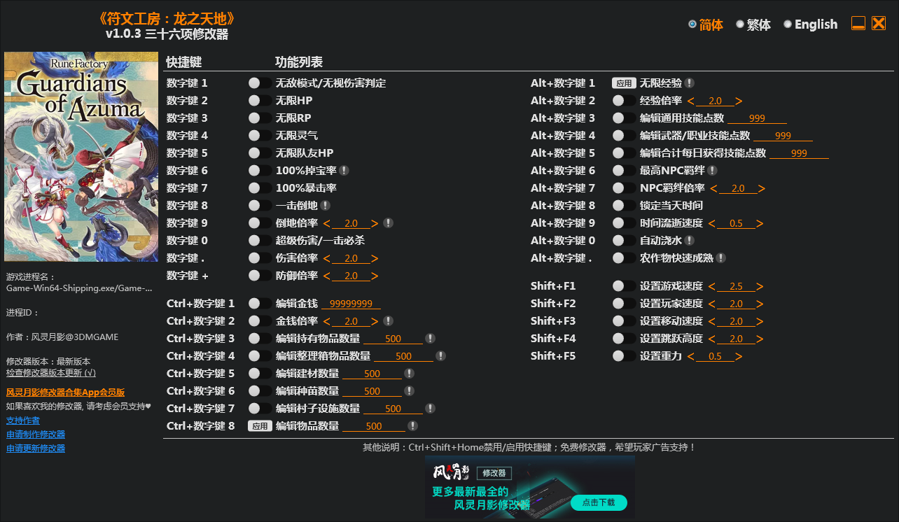 符文工房龙之天地修改器功能