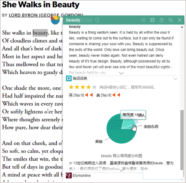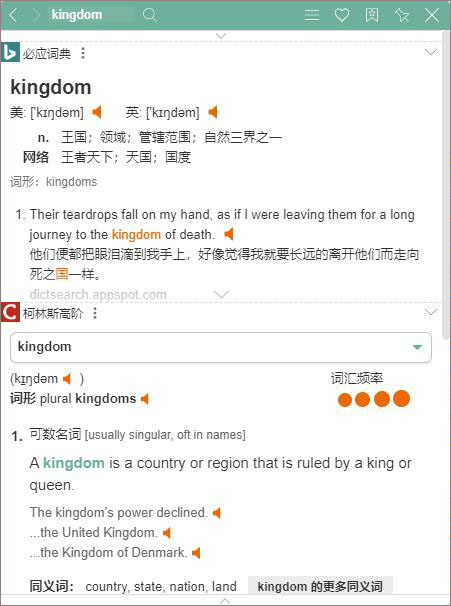 1、多词典支持,英汉、英英、俚语、词源、权威例句、汉语(繁简)、释义分布图、谷歌翻译