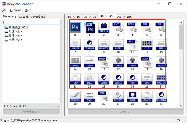 支持把图标保存成ico、bmp、png、gif、tif、jpg、tif、psd、tga、pcx格式。