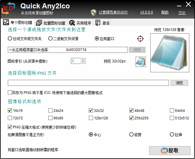 Quick Any2Ico支持两种模式:从任何文件或文件夹转换和从二进制文件资源中提取