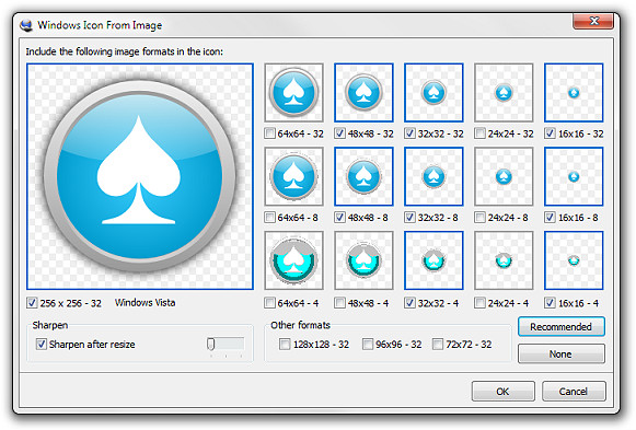 6、使用“图像/从图像创建 Windows 图标”菜单项从图像创建图标。在此窗口中按推荐按钮。这将为图标选择所有需要的图像格式。按确定按钮。使用所有需要的图像格式创建一个图标。
